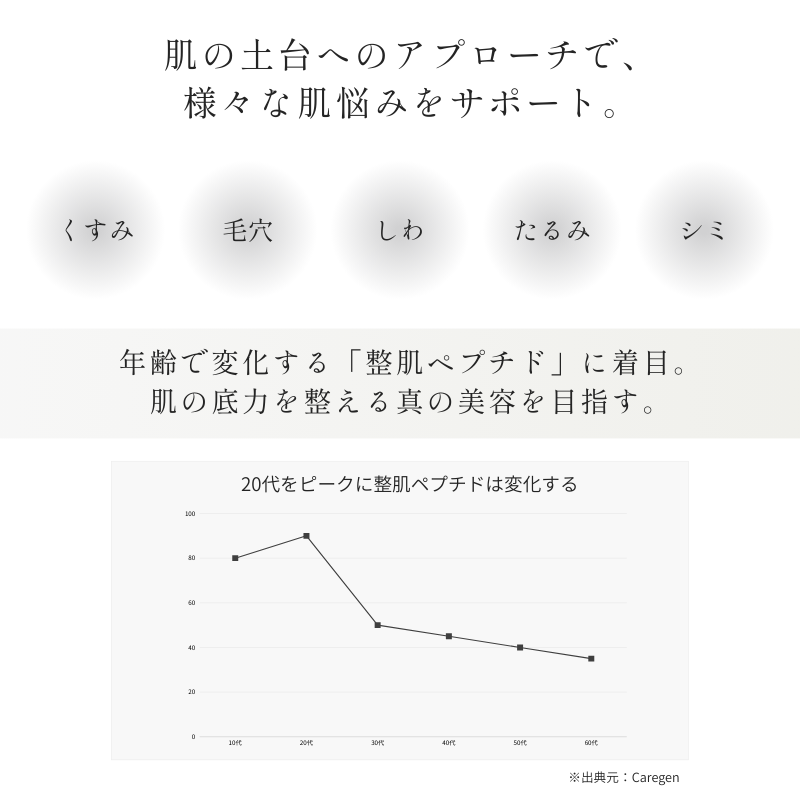 | 素材 | 全成分:水、ペンチレングリコール、グリセリン、ヒト遺伝子組換オリゴペプチド-1、ヒト遺伝子組換ポリペプチド-11、合成ヒト遺伝子組換ポリペプチド-31、アセチルデカペプチド-3、オリゴペプチド-20、オリゴペプチド-24、水添レシチン、コレステロール、BG、PG、クエン酸Na、クエン酸、レシチン、ダイズ油、水酸化Na、オレイン酸Na、EDTA、フェノキシエタノール |